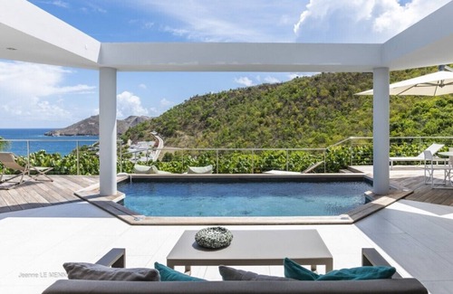 Magic Bird is situated on the hillside of Flamands. This contemporary villa is at only few hundred meters from the beautiful beach of Flamands. It overhangs the bay, the hills and the ocean. The large living is opened onto the terrace and the pool. The two bedrooms are on each side of the living.