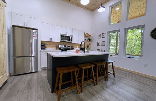 As you step inside, you marvel at the stunning double glass doors and are welcomed by sleek, modern design and cozy comfort in every corner. Whether you're gathered around the fire pit for s’mores under the stars, enjoying dinner on the outdoor dining table in the tree top canopy, or relaxing on the huge covered deck queen swinging bed, this cabin has all the amenities for a relaxing escape.
