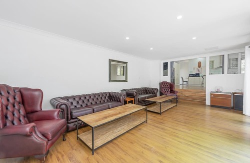 two indoor living areas including downstairs sitting room with Chesterfields and huge entertainment room with 85 inch TV, 75 inch TV in kitchen and 65 inch TVs in three bedrooms (Netflix, Kayo, Stan available)