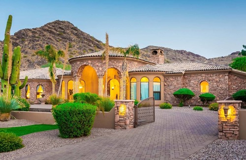 Elegant Desert Estate with Pool, Theater & Mummy Mountain Views Welcome to an extraordinary escape in the heart of Paradise Valley. This expansive 8-bedroom, 6.5-bath villa blends timeless Tuscan architecture with refined Arizona luxury. Perched beneath the iconic Mummy Mountain, the estate offers panoramic views, serene surroundings, and every amenity needed for a memorable group getaway.