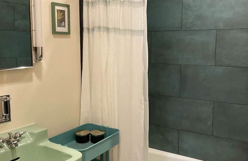 Two large entry rooms provide ample space for storage, bikes, gear, etc. Open kitchen/ living room layout with cork flooring. High ceilings throughout and two large egress windows make this basement space bright and airy. Bedroom is small and cozy and partially open to living room above a half wall. Bathroom has a beautiful tile and 50’s fixtures original to the house.