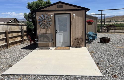 Furnished & clean tiny home in the country yet minutes from biking trails, I-70, and Country Jam. Just a few Minutes away from Mack's Ridge Trail, Kokopelli Trail, Troy Built and more. Gas, convenience store and restaurant in Loma which is 8 minutes away. Fruita is 15 minutes away and has all the amenities including a steakhouse. In the tiny house the living area has a wall hung TV, desk, shelves for clothes, furnished kitchenette with cabinets, stove, sink and small refrigerator. New couch folds out to queen size bed. Bathroom has washer/dryer combo, bathtub/shower, and toilet. Attached shed for extra storage with full size refrigerator. Wireless internet and large parking area. Enjoy private sitting area outside and beautiful country sunrises and sunsets. If you enjoy farm animals, you'll love the horses, donkeys and chickens on the property. Help yourself to fresh farm eggs! Home is best suited for 1, but will sleep two comfortably.