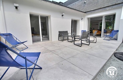 This single-story cottage offers: - A beautiful living room with a wood-burning stove, a living room with a fully equipped kitchen, and a laundry room. - A master suite with a king-size bed (can be divided into two single beds) with a bathroom and toilet accessible to people with reduced mobility, and a work-from-home area. - A separate toilet with a washbasin. - A bedroom with a king-size bed and a single bed. - A bedroom with a queen-size bed and a single bed. - A shower room with a toilet. - Small library area. Outdoors: - Large enclosed garden of 2000m², two terraces, a dining table, garden furniture, a parasol, a barbecue, and deckchairs. - Parking: 2 vehicles on the property. - The cottage is adjoining the owner's home. In a privileged environment on the Gulf of Morbihan side, in a secure residence, come stay in the Coet Tal Er Mor gîte and spend an unforgettable holiday! Here, in the estate, you will have direct access to Kerbilouet beach for lovers of swimming (200m walk), relaxation and sandcastles! Here, the Gulf of Morbihan, one of the most beautiful bays in the world, opens its doors to you with its islands, ports and coves. 10 minutes away, discover Vannes, a city of art and history.
