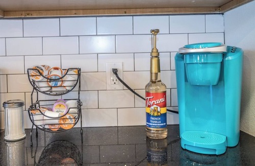 In the kitchen, you'll find everything you need for cooking and dining, including a toaster, Keurig coffee maker with various coffee and tea options, creamer, sweetener, blender, oven, microwave, and a kitchen island with bar stool seating. Additionally, all necessary pots and pans, plates, cups, and cutlery are provided for your convenience.