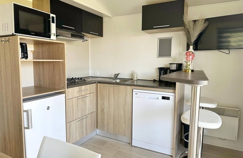 This charming chalet has a cosy balcony, free WiFi, air conditioning and a smart TV. The open kitchen is fully equipped and offers everything you need for a carefree stay. In the small, cosy living room you will find a comfortable sofa and a dining table for cosy meals. There is also a charming bar with two high stools.