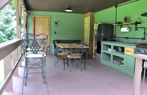 The camp kitchen is open air on two sides so bugs may show up occasionally but you are well protected from wind and weather. It has a refridgerator/freezer, 4 burner gas flattop grill, NuWave induction cooktop,concrete counter space. Dinner seating for six, including plates, bowls, silverware and all styles of glassware and cookware. Ice is available for you drinks and cocktails. I'll collect all your used glasses and dishes at the end of the evening and wash return them for your breakfast. There is an outdoor sink for washing and rinsing food if you prefer that. Open fire cookware is also available.