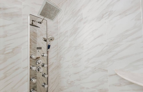 This modern apartment features 2 bedrooms with 3 king-size beds and 1 bathroom. Enjoy a 65-inch TV in the living room, 55-inch TVs in both bedrooms, and a luxurious jet shower for a spa-like experience.
