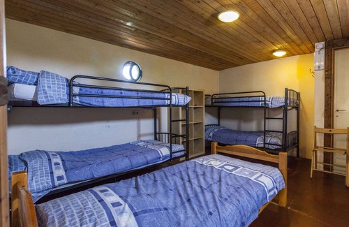 Layout: Boat: (Sitting room, open kitchen(oven, microwave), bedroom(2x single bed, bunk bed), bedroom(single bed, 2x bunk bed), bedroom(single bed, 2x bunk bed), bedroom(single bed, 2x bunk bed), bedroom(single bed), bedroom, bathroom(shower, washbasin), toilet)
