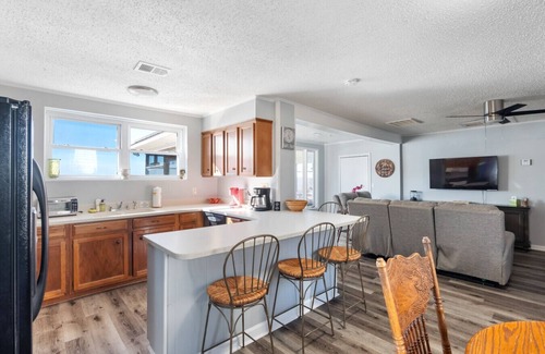 Inside the home you will find a well stocked kitchen, comfortable living room with flat screen tv and Pac Man Arcade Game, as well as two bedrooms and a full bath. The first bedroom includes a King bed while the other bedroom has a queen bed. Both bedrooms feature comfortable bedding and large windows with lake views. The shared bathroom features a tub/shower combo.