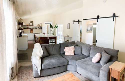Spacious 1 bed, 1 bath brand new custom built home. Some of the unique features of our home are; a large kitchen island with seating, open shelving that wraps around the kitchen, turf putting green in the backyard space (putters & balls provided), shiplap vaulted ceilings & concrete floors throughout the entire home, large sliding barn doors, a walk-in wall tiled shower & a cozy King Bedroom complete with a TV & walk-in closet. With an additional twin sleeper sofa bed located in the living room. If you have any questions about the home & overall space feel free to message us!
