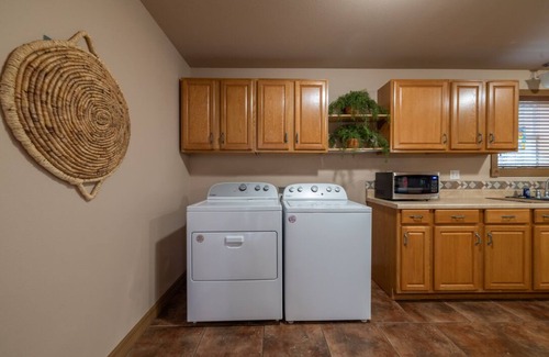 Escape to this charming 2-bedroom retreat, perfect for up to 5 guests. After a day of adventure, unwind in the comfort of a king bed and a full bed. The cozy living room invites you to relax, or step outside to grill and enjoy the scenic view of animals just across the fence. For the ultimate relaxation, take a seat in one of the 3 wooden swings or lounge in the spacious hammock—each sheltered under a roof so you can enjoy them in any weather, whether sun or rain.