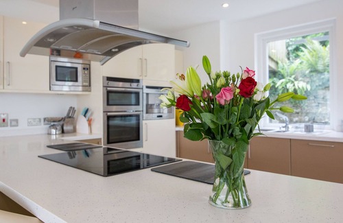 SHORT BREAKS AVAILABLE. A very spacious stunning new modern house with incredible views, overlooking Whitsand Bay and Seaton Beach. This very private house sits in 32 acres of fields and planted vineyard. Hardwood gates lead to parking area for 8 cars. This is the ideal home for family gatherings & celebrations. The house sleeps 13 with 3 doubles (2 ensuite) 2 single rooms, 1 twin room, 1 triple room (3 singles). 2 bathrooms & 2 ensuites plus cloakroom. The huge open plan family room & designer kitchen is decorated to a very high standard. Ground floor is underfloor heated & marble floored throughout, upstairs is central heated. There is a spacious dining room, a 2nd snug/living room and utility room. The kitchen is extremely well equipped with integrated coffee machine etc. Full length bi fold doors lead to a huge decked area with outdoor heated swimming pool, BBQ/outdoor dining & seating area. The family room has large flatscreen TV and digital player/IPod player. Broadband provided. Dogs welcome