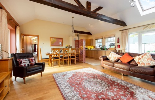 Ideal for a family or group of friends/work colleagues with it's flexible layout of bedrooms. The cottage is all on one floor with a lovely sitting room featuring oak floors, colourful rugs and a wood burning stove, it comes complete with Free sat HD TV, DVD player, hi-fi with iPod dock and free wifi. Open plan to the kitchen and dining area with natural travertine floor & fully fitted kitchen with washing machine and dishwasher. French windows out onto the patio and garden.