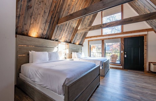 Unwind & Relax in this log cabin styled spacious vaulted peak ceiling room with two Queen beds and an electric fireplace for everyone to enjoy. Equipped with a luxurious bathroom with a walk-in shower, quality bath products, Kitchenette, and Smart TV. Enjoy the fresh mountain air and your morning coffee by walking right out your door to the deck, where you have two chairs that immediately showcase a beautiful lakeview sunrise.
