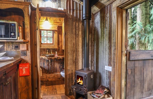 Amenities: Electric heaters. Induction hob, combi microwave/oven, fridge with ice box. On-site WiFi. Fuel, power, and starter pack for woodburning stove inc. in rent. Bed linen and towels inc. in rent. Highchair and travel cot available on request. Off-road parking for 1 car. Front decked area with furniture and barbecue, and access to 28-acres of woodland. Two well-behaved dogs welcome at a supplement of £10 per dog, per stay. Sorry, no smoking. Small shop 4.4 miles, supermarket 9.7 miles, pub 2.5 miles. Note: There is a communal utility on offer, with a shared washing machine and tumble dryer. Note: Steps up to the hut. Note: This property is unsuitable for those with limited mobility, and the rural lane access causes difficulty for low profile sports cars and wheelchairs. Note: Check-in from 4pm, check-out by 10am. Note: Poor phone signal due to rural location. Note: Single track access, small ford and cattle grid at entrance. Note: Welcome pack provided and small honesty shop on-site