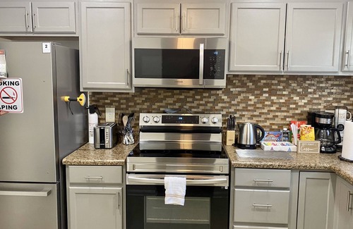 All brand new stainless steel kitchen appliances: refrigerator/freezer, over-the-range microwave, stovetop oven, and dishwasher with dishwasher tabs included under the kitchen sink. The kitchen is well equipped with complimentary coffee (regular & decaf), both a *Keurig K-Select* single serve coffee maker and drip coffee maker with condiments, assorted tea, hot chocolate, oatmeal, waffle bar, and a Brita water filter pitcher in the fridge for every stay. We also provide oil & vinegar, salt & pepper, a block of cutting knives, cutting boards, pots and pans, cups, wine glasses, bowls, plates, silverware and utensils including reusable chopsticks and straws, an electric kettle, electric wine bottle opener, toaster, rice cooker, and large capacity air fryer*. We have everything you need to cook at your stomach’s delight!