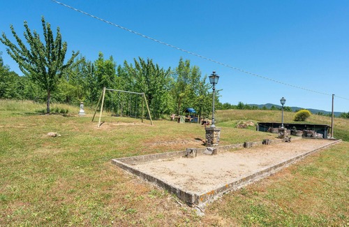 This vacation home is part of a typical Tuscan manor house divided into 9 apartments, with communal pool and set on 12 hectares of fenced land with lawn and woods. The manor house is located 4 km from Poppi and offers a wide and suggestive view over the valley of the Parco Nazionale delle Foreste Casentinesi. Your vacation apartment is located on the mezzanine floor, accessible by an external staircase with 9 steps and with independent entrance. Outside there is a reserved area for pleasant lunches in the open air. The house is surrounded by a large garden (1 hectare) where children can have fun in an equipped area and adults can play bocce, table tennis, volleyball and relax in the 5-seater jacuzzi. Inside the manor house you will also find two common rooms with fireplace, and further a barbecue area with wood stove. On site there is the possibility of purchasing homemade cold meats, on request the owners can organize cooking and pizza preparation courses, as well as lunch and breakfast.