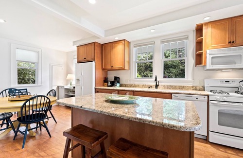 Inside, you’ll find a warm and inviting living space featuring an indoor fireplace-perfect for curling up with a good book or enjoying a quiet night in. The large, well-equipped kitchen offers everything you need for easy meals or leisurely dinners at home. Just off the main living area, the bright and airy sun porch invites you to sip your morning coffee as the light filters through the trees or spend a peaceful afternoon lost in a book.