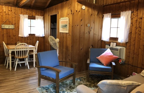 Cabin 3 is referred to as "The Beach," and sleeps 4. The cabin is roughly 400 square feet, with an open floor plan. The main sleeping area sleeps 2 on the king bed, and the sofa sleeper has a queen pull out that sleeps 2. The living room features a sleeper sofa, chairs, and flat screen smart tv. The cabin has an updated bath with a standup shower and a fully equipped kitchen. The rental also provides access to paddle boats, kayaks, and paddle boards, as available. The cabin sits on a couple of wooded acres on the lake, providing waterfront, woods, and access to beaches and the pier.