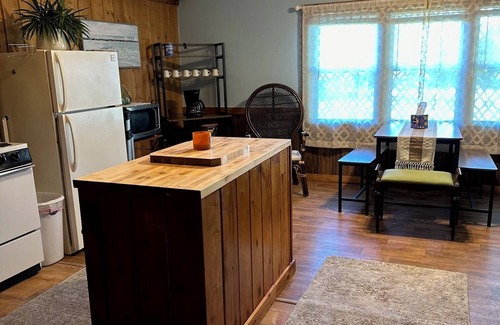 This cabin offers a full kitchen and living space. As well as two separate bedrooms, each with a queen bed and extra pillows and blankets. One full bathroom just off the living room, stocked with towels, shampoo, conditioner, and body wash. There is an outdoor patio area with a table on the deck, a grill, a fire ring, and chairs will be provided for outdoor use.