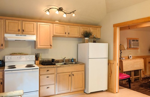 The warm living room is equipped with a full-size futon sleeper, a furnished kitchen - fridge, stove, coffee maker, tableware, toaster, and a table. The kitchen is well equipped so you can cook warm meals for your family and friends.