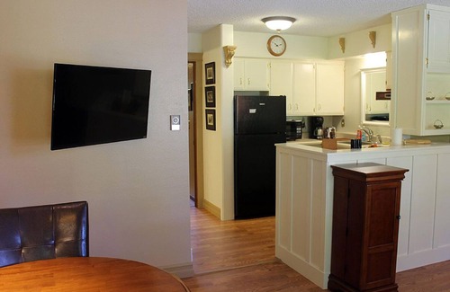 The full kitchen (stove, oven, microwave, blender, coffee bar, refrigerator and crock pot) is stocked with all basic cooking and dining utensils. The living room has a small dining table with a pair of comfortable side chairs and a television with wifi. The bedroom has a queen-sized mattress and plenty of closet space.