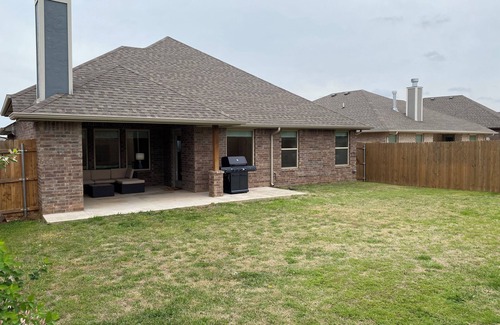 Cozy cottage in quiet neighborhood located in NW Oklahoma City. Only 16 miles from downtown. Easy access to turnpike/interstate. Features an open concept layout with outdoor patio to include a gas fireplace and a grill. Three bedrooms each with King sized beds and two full size bathrooms. High speed Wifi and two 65" Smart HD TVs with DirecTV. Full size washer and dryer. Fully equipped kitchen has a refrigerator, double oven, 5 burner gas stovetop, microwave, and dishwasher. Lots of natural light with four large windows that overlook the outdoor living area. Living room has a gas log fireplace that provides a cozy setting for hanging out or reading your favorite book by the fire. Master bath has an oversized walk in shower with two showerheads including a rain shower head. Fenced in backyard is the perfect size for fur babies to run around and play. Has a neighborhood pool, playground and basketball court. 5 miles away from Mercy Hospital if visiting a loved one for long term stays and close to downtown for all of your entertainment needs. 6 miles from Lake Hefner. Close to Rockwell exit off of Kilpatrick Turnpike. Near Edmond and surrounding areas!