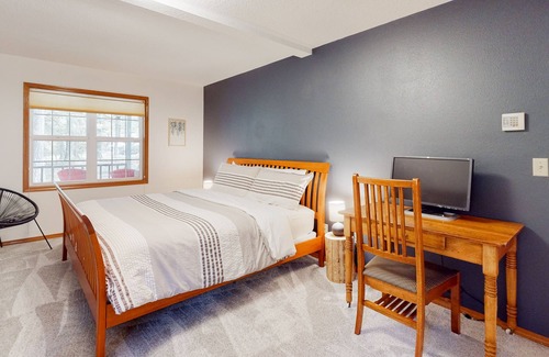 The first floor of this charming home enjoys a primary bedroom with a TV, a gas fireplace, a desk with a monitor, and an exquisite en suite bath with a shower with a built-in bench and a soaking tub in the corner with great forest views. The remaining guest bedrooms are located upstairs, sharing a full bathroom. Whatever you are looking for, you have found it here!