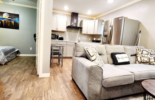 This modern apartment has a completely private entrance and its own driveway. It comes with a fully furnished kitchen, washer, dryer, stove top, tvs in both the bedroom and livingroom, and a brand new mini split AC that will get the place ice cold! I hope you love it as much as I do :)