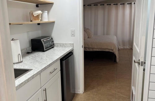 Large studio efficiency with a queen bed, newly remodeled full bathroom with a huge shower and an efficiency kitchen with sink, mini fridge and toaster oven just steps from Downtown’s fabulous restaurants, breweries and live entertainment. This unit is attached to a two bedroom/one bath home that is rented separately.