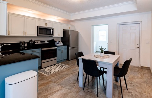 With tall ceilings and ample space, our condos are perfect for families, friend groups, and even extended stays for working guests. Whether you're visiting for leisure or business, our condos provide a comfortable and inviting atmosphere. Relax on the comfy sofa and watch your favorite movie on the flat screen TV or enjoy a meal around the dining table in the eat in kitchen.