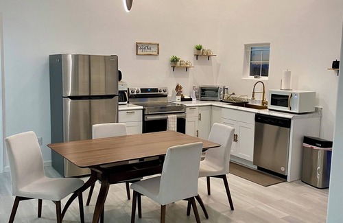 Guests will enter their accommodation through the main lobby (a shared space) and make there way to their private designated dome. The lobby has a a full kitchen featuring a sink, refrigerator, freezer with icemaker, oven with range, and a convenient dishwasher to make cleanup a breeze. Guests who book the entire space will be given access to the laundry room. Each dome has a private separate code for additional safety. The lobby is a shared space and other guests may be utilizing it as well. Guests have a private kitchenette in each dome however, the kitchen sink and dishwasher are located in the lobby space.