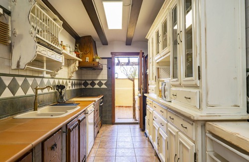 With a two-storey architecture that preserves high ceilings and wooden beams, the house conveys a cosy and rustic atmosphere. On the ground floor, there is a spacious living and dining room with a wrought iron fireplace and exposed beams, ideal for family gatherings and moments of relaxation in front of the television. The rustic kitchen is fully equipped —including fridge, microwave, oven, dishwasher, coffee maker and more— and connects to a private patio with outdoor furniture to enjoy afternoons outdoors and sunsets. 🍳🔥