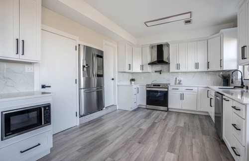 On our top floor, we have a master bedroom with a king bed/master bath, attached is a room with a twin bed and a vanity. From the master bedroom, you can step out on our balcony for the best view in the house! Our middle floor is the kitchen, dining area, living room and deck! Our bottom level has 3 queen bedrooms that share a bathroom with a shower. Our white couch turns into a bed that sleeps 2 guests as well.