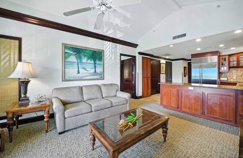 Easily accommodating 6 people, this two-bedroom suite features one king bed, one queen bed, one extra-long full bed and a queen sleeper sofa. The stately kitchen includes a Wolf glass cooktop and oven, Sub-Zero refrigerator, GE profile microwave, Fisher Paykel dual dishwasher drawers, granite counter tops, African Mahogany cabinets, along with three full bathrooms surrounded with Peruvian Travertine stone. Enjoy the clean design and convenient location, with the beach and countless Kaua’i adventures just steps from your ocean view suite.