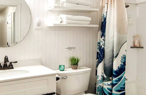 The entire top floor (1500 sqft.) is accessible and has two bedrooms, 2 bath, one with walk-in shower, and the other with shower and bath tub. Well-stocked kitchen, dining room, large deck, and open living room. There is a private fenced yard outside the front door for your enjoyment with propane or charcoal grills.