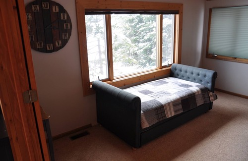 Our 2 bedroom home features a king bed and daybed with trundle in the lakefront bedroom, a queen bed in the second bedroom. Bathroom has tub and shower, and a washer/dryer is located in the hallway. Kitchen and living room are an open concept with spectacular views of Devil Track Lake. High speed internet is available in also television.