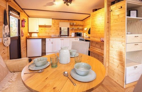 The lodge has an open plan kitchen diner, with two bedrooms; one double (king size bed) and the other a twin room with full size single beds. There is a shower room between them. The lodge has two outside seating areas for guests to sit out and enjoy the tranquility of the woodland setting, listen to the bird song and spot the wide range of wild life.