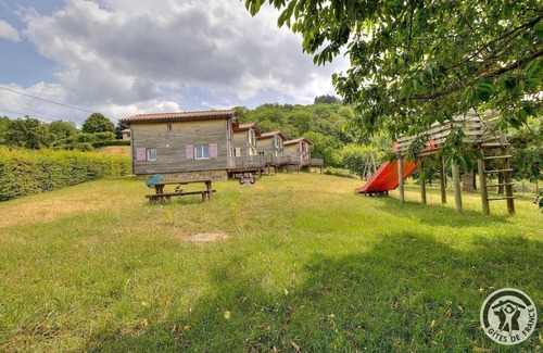 Block of 4 chalets in a peaceful, leafy spot with lovely views of the hilly countryside. Unspoilt setting far from the city bustle, ideal for having a restful holiday. Nearby : hiking & mountain biking trails (the village is crossed by the track 'Compostelle-Cluny-Le puy en Velay'), leisure area (play area for children, boules area, table tennis), inn (takeaway food). Detached wooden chalet set in a meadow including 4 identical buildings. Accessed via terrace (wooden stairs) or practically single level access (1 step) via kitchen on the other side. Ground floor : living room (double sofa bed), kitchen, WC. 1st floor : 2 bedrooms (double bed, balcony), (2 single bunks), bathroom. TV point. Bed linen not supplied (no renting possibility too). Large meadow. Parking. Barbecue is not allowed on-site (a fixed one is available in the leisure area). Close to the village hall & a public campsite (6 pitches). Ideal for groups, seminars, courses. Disc golf : 5km. Adventure Park (outdoor activities sports) : 10 km. Zoo : 20 km.