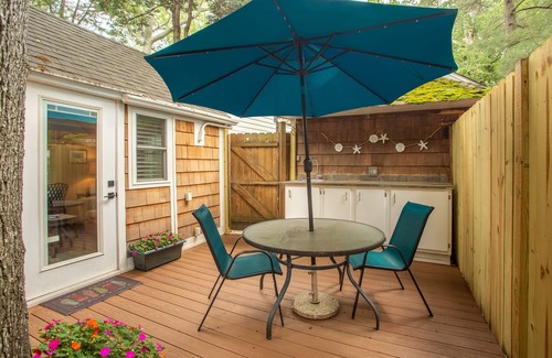 OVERVIEW: It's a quick walk to the beach! Nestled in The Pines, this cute cottage is the perfect getaway for a couple or a small family. It is an efficiency condo with a double sleep sofa, full bathroom, kitchen with microwave/convection oven, and compact refrigerator. A lovely private deck area is tucked away and perfect for breakfast or romantic dinner.