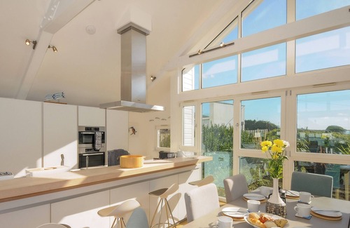 A contemporary, elevated holiday home overlooking Polzeath beach, can sleep six - eight guests in four bedrooms.