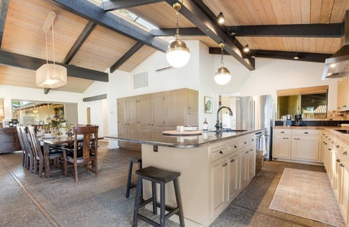 Guests will feel like nobility upon arrival at Dundee Landing. Once you've traveled over your own private bridge, and through the gated entrance, this secret gem is brilliantly revealed. The stunning one-level features unique characteristics such as; East and West Patios equipped for outdoor cooking and entertaining, a converted 4-car garage that is the ultimate recreational and exercise area which contains multiple table games and a wet bar, and all you will need to stay fit when the weather prevents going outdoors. Aside from the splaying 5 acres of outdoor space, You will immediately find yourselves in the great room with an amazing open-concept space. A grand dining table for ten, a chef's kitchen with island seating, and a large living room with a wood-burning fireplace and SmartTV create an inviting space for all. Warm wooden beams and bright walls have the perfect tones for bringing the outdoors in. And the outdoor living features patio dining tables on both the east and west sides of the property, and the east also features a wood-fired pizza oven and Weber Grill.