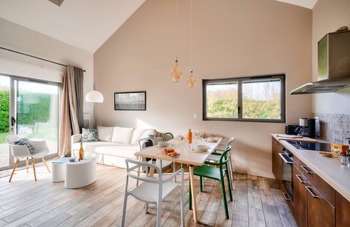 The house is modern and well laid out. On the ground floor is the living room, an open and bright space. Here, you will enjoy sharing moments of conviviality and good meals. As for the kitchen, it is open and well-equipped, with induction hobs, a refrigerator, a microwave, an oven, a freezer, a dishwasher, coffee makers, a toaster and a kettle.