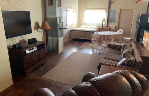 A quaint little fishing cabin tucked into the hills of Grand River. One bedroom with a comfortable living area, full kitchen, and dining area-with the unique opportunity of opening the overhead garage door overlooking the river to bring your enjoyment of the outdoors inside. All the comforts of home just steps away from beautiful Grand River. Free boat launch with reservation.