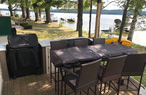 Kayak, SUP use included. Bon fire pit, large deck with seating and bar table. Outdoor kitchen. Hot tub is not included in rental.