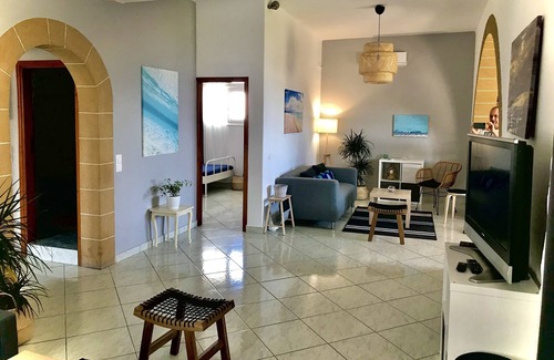 • Living room. It has a view of Agriolivado beach. It consists of two single living areas, where there is a comfortable folding sofa bed (double). It has Air conditioning and satellite TV.