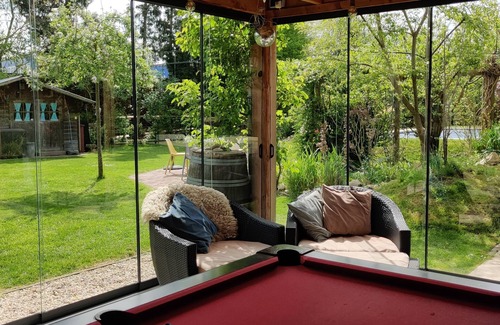 The canopy with kitchen is fully equipped with sliding glass walls. In the middle of a huge flower-rich garden in a unique sustainable accommodation. In the center of the bustling city of Tilburg, on the Wilhelmina Canal. Walking, cycling, culture, nature and relaxing on a lounger by the pool, in the private sauna or the jacuzzi watching a night sky perfect for star gazing in this green oasis. Bathroom, sauna and jacuzzi for private use, swimming pool and garden shared with the host's family.