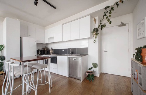 Offering a serene location along the Yarra River, but just footsteps from bustling Johnston Street, this Abbotsford apartment is a sun-drenched escape brimming with greenery. Modern and well-equipped, an open flow with timber flooring adds to the apartment’s spacious feel, while a sliding glass door opens out to the compact balcony revealing idyllic views of Abbotsford Convent and the suburb’s modest skyline. Astroturf and potted plants create a comfortable spot to savour the outdoors, with a two-seater table for sipping your morning coffee or unwinding with an evening drink as the sun sets.