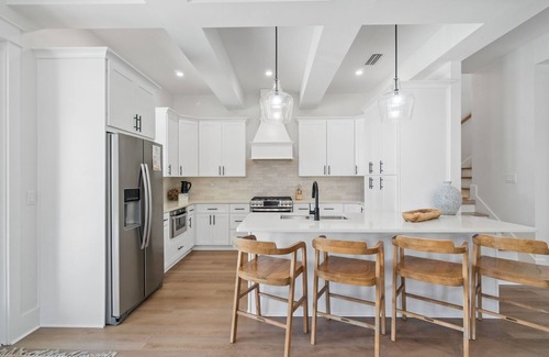 Inside, you'll find a thoughtful layout that makes it easy for everyone to come together. Four king bedrooms give plenty of privacy for adults, while two bunk rooms are a fun spot for kids or teens to make their own. The main living space feels open and airy, with a chef's kitchen that flows seamlessly into the dining area and living room. It's the perfect setup for sharing meals, playing games around the table, or simply enjoying time together without ever feeling crowded.