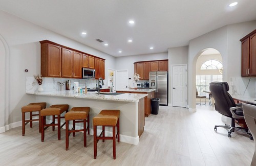 Centrally located within six miles of Florida's renowned theme parks, this completely renovated home is the perfect choice for your next escapade with family and friends! The highlight feature that will have you visiting year after year is the heated pool, which is exceptionally larger than most pools in the area! Spend memorable evenings relaxing in its waters or the attached pool spa, treating yourself to soothing baths. The fully fenced yard and enclosed lanai include an outdoor dining area, poolside loungers for sunbathing, and a patio with ample cushioned furniture.